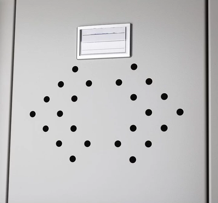Двери шкафа оснащены вентиляционными отверстиями для воздухообмена и информационными табличками для имён. Модель предусматривает возможность смены стороны открывания дверей.